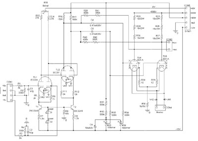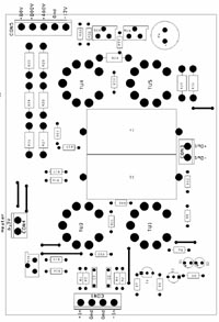 If the amplifier is connected to the power supply you can begin with adjustment. First put all pots to center position. Connect the input to ground and adjust the output voltage at +Out using R35 and -Out using R36 to +460 Volt. You have to repeat the adjustment until the voltages fit, because the output voltages are interacting a little bit.